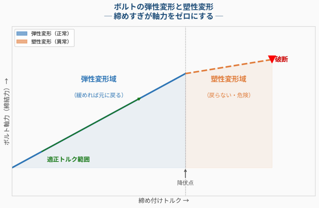締めすぎはボルトの「塑性変形(そせいへんけい)」を招きます。