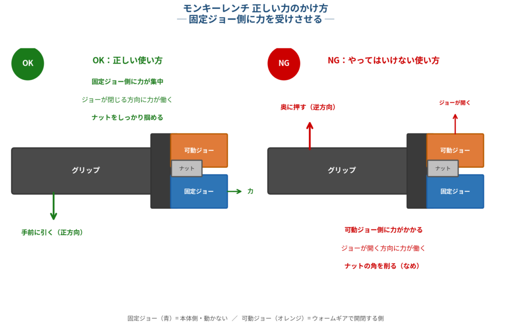 可動ジョー側に力をかけると、ジョーが開く方向に逃げてナットがなめます。