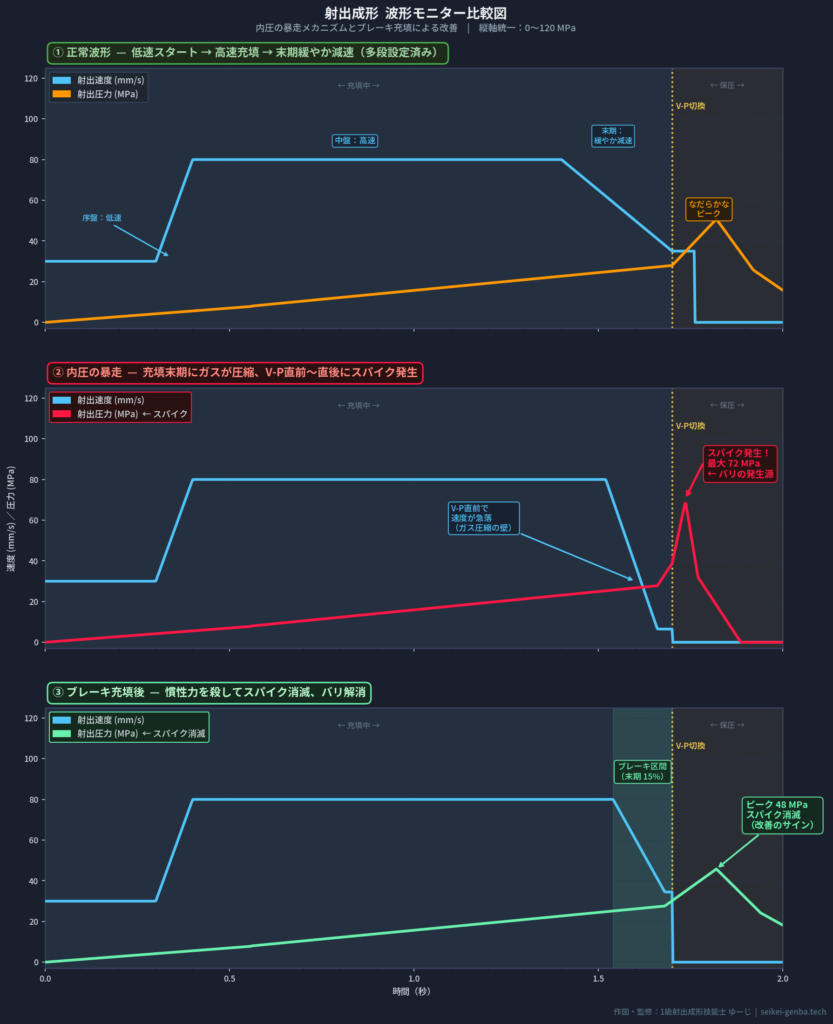 充填完了直前にスクリューをエンジンブレーキのように緩やかに減速することで、このサージ圧を殺します。目安:中盤80mm/s → 末期40〜48mm/sに設定し、波形のスパイクが消えるか確認。